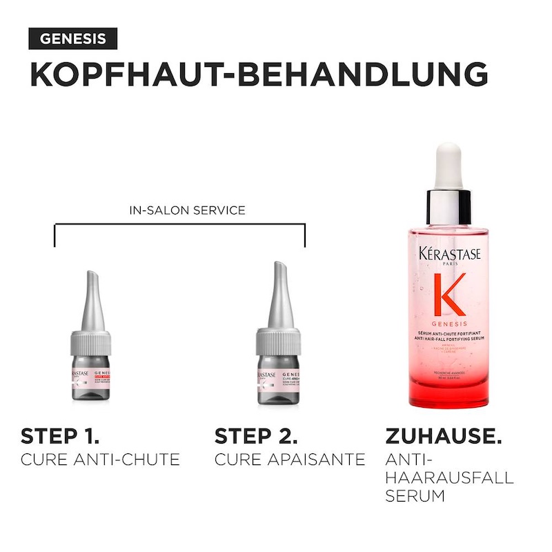 Intensive Anti-Haarverlust-Kur: Kérastase Genesis Cure Anti-Chute stärkt die Haarwurzel, beruhigt empfindliche Kopfhaut und reduziert reaktiven Haarverlust sichtbar. 4-Wochen-Ampullenkur für kräftigeres, gesundes Haar.