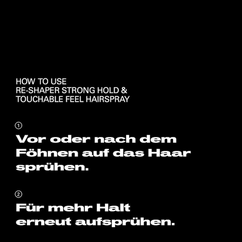 Halten Sie das Hairspray 20–30 cm vom trockenen Haar entfernt und gleichmäßig aufsprühen. Für extra Volumen oder gezielte Akzente direkt auf die Haarpartien sprühen.