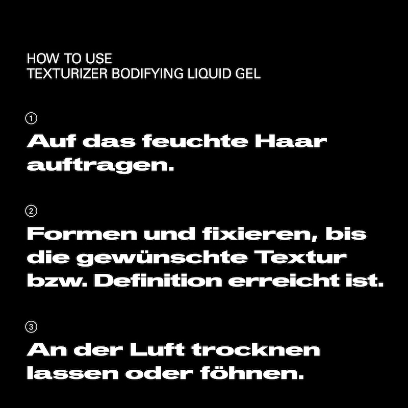 Eine kleine Menge in das feuchte oder trockene Haar einarbeiten. Anschließend föhnen oder lufttrocknen lassen und nach Wunsch stylen.