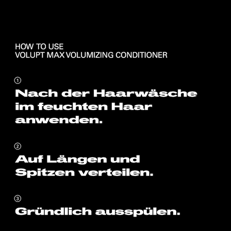 Nach der Haarwäsche eine großzügige Menge im feuchten Haar verteilen. Kurz einwirken lassen und gründlich ausspülen. Für beste Ergebnisse in Kombination mit dem Volupt Max Volumizing Shampoo verwenden.